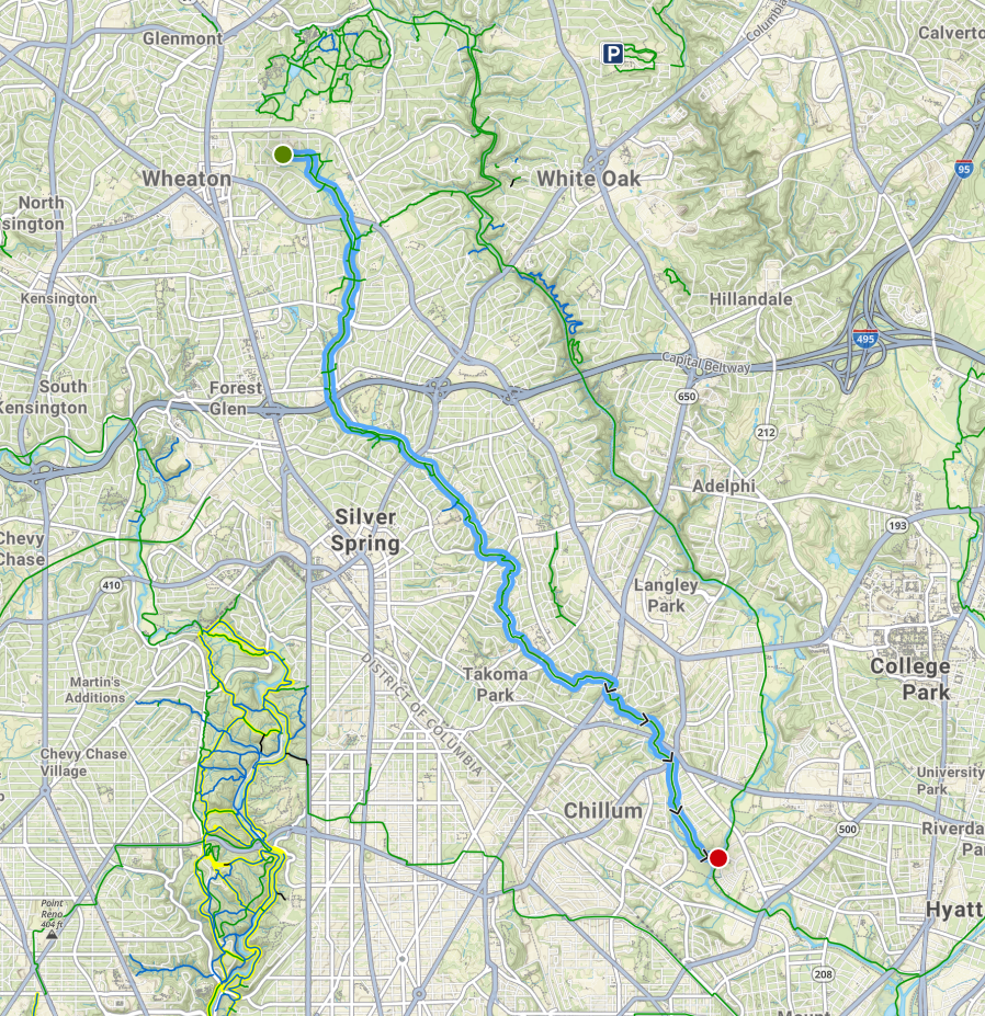 Living off the trail I started using it to connect to DC for my long runs. Push far enough south and Sligo meets the Northwest Branch Trail in Hyattsville, which follows the Anacostia River into the city. If you need the miles, you can run to the end of the Anacostia River Trail without leaving the paved path.